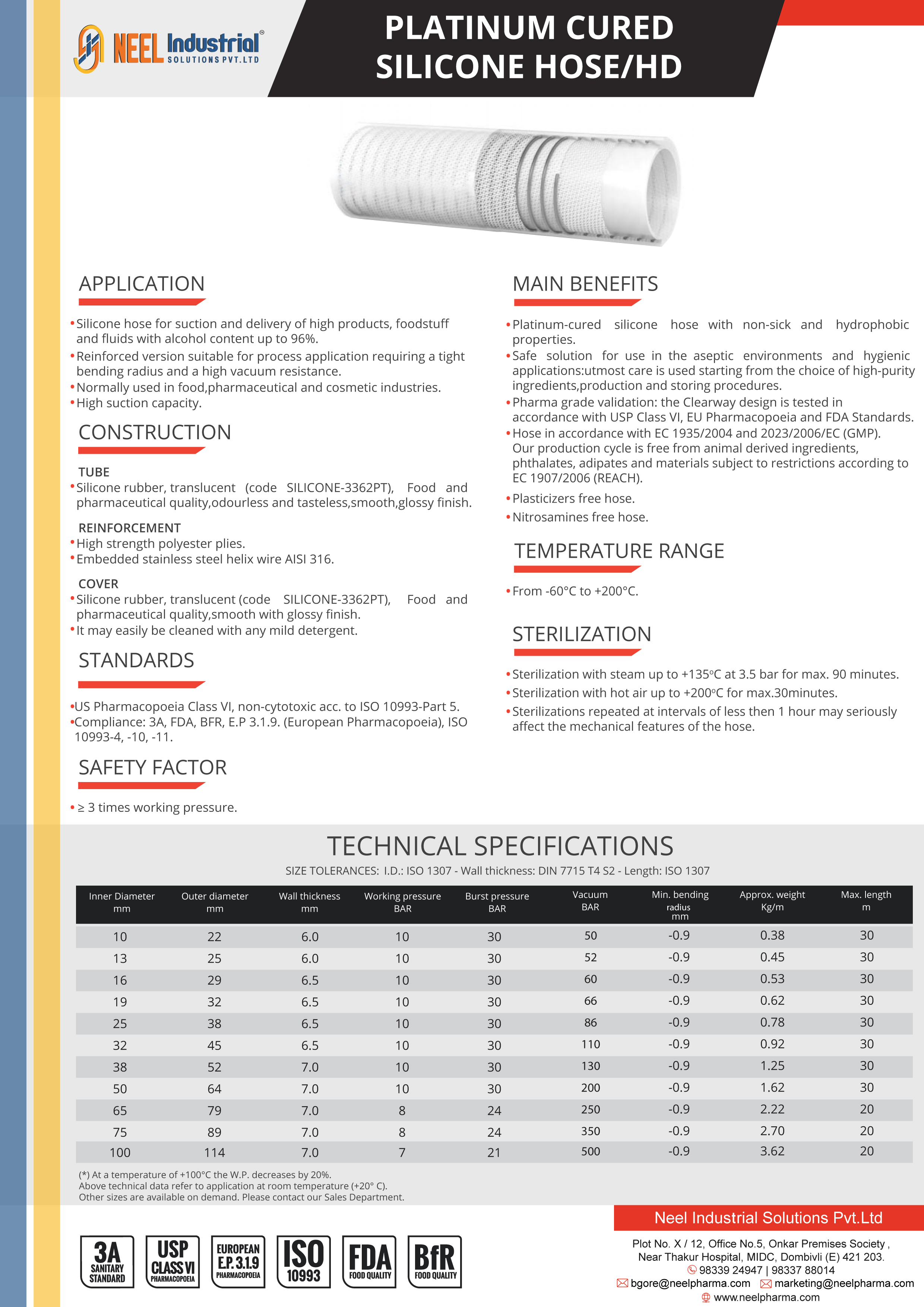 Type Platinum Cured Silicon Hose® is manufactured from High purity platinum cured Silicone with AISI 316 stainless steel helix and 4 layers of polyester reinforcement.