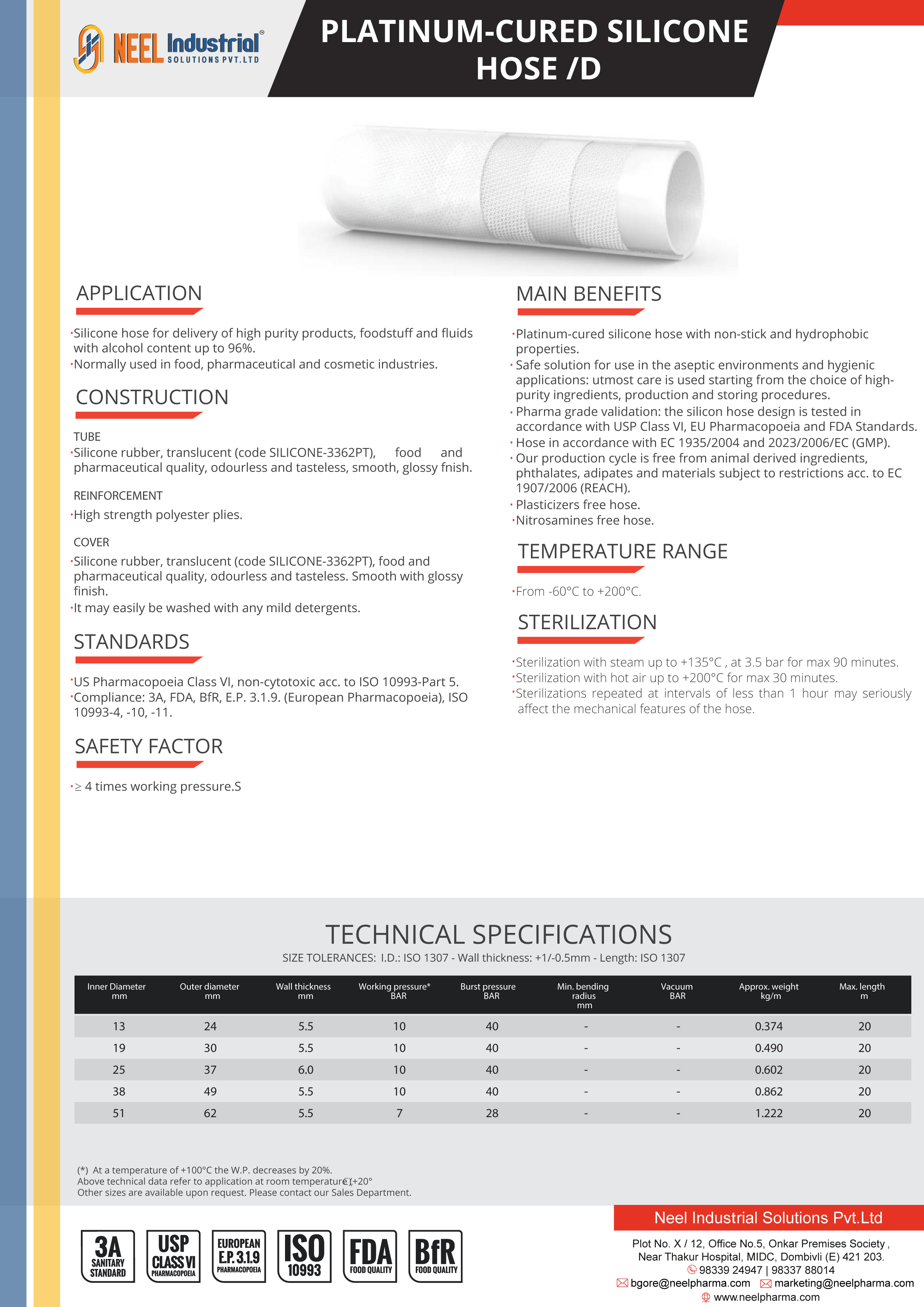 Silicone hose for delivery of high purity products, foodstuff and fluids with alcohol content up to 96%. Normally used in food, pharmaceutical and cosmetic industries.