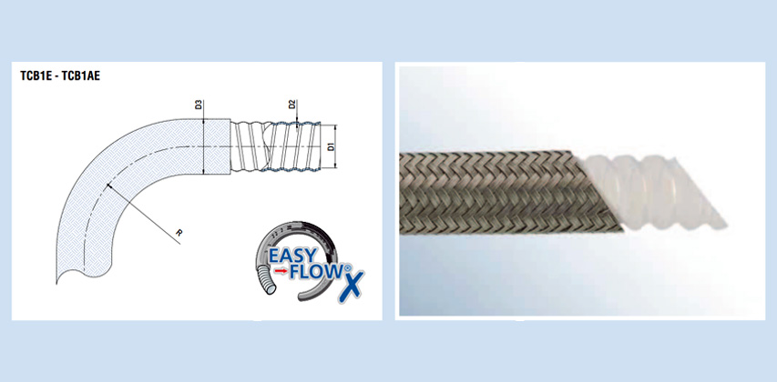 Low profile helically convoluted PTFE (polytetrafluorethylene) liner with a AISI 304 high tensile, stainless steel braid.