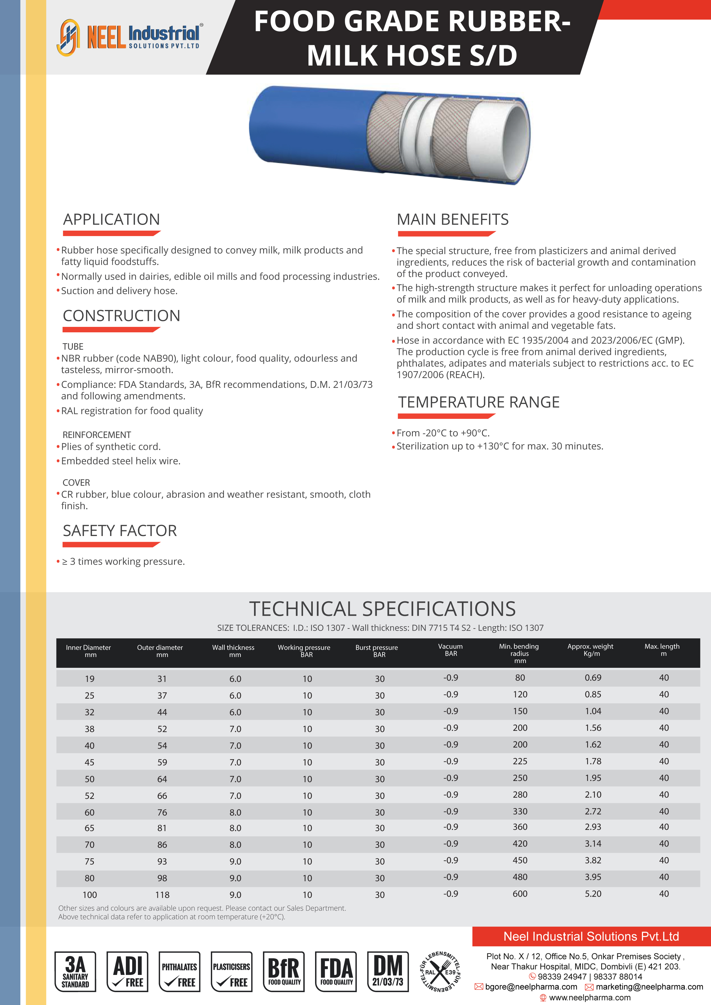 Multipurpose hose specifically designed for conveying pharmaceutical, cosmetic, chemical and food industries. Rubber hose specifically designed to convey milk, milk products and fatty liquid foodstuffs. Normally used in dairies, edible oil mills and food processing industries. Suction and delivery hose.